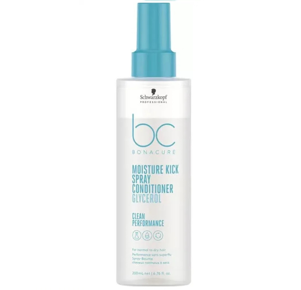 Schwarzkopf Professional Bonacure Moisture Kick Spray Conditioner Glycerol 400ml este un balsam sub forma de spray, care hidrateaza instantaneu parul de la normal la uscat și parul casant sau cret. Hidrateaza firul de par și fixeaza moleculele de apa. Descurca parul si îl face mai usor de pieptanat. Netezeste suprafata fibrei capilare.